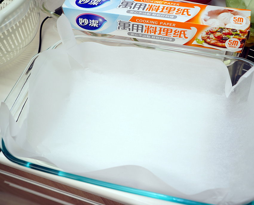 ▼另外將烘焙紙鋪在容器中,等糖蜜煮好就可以直接倒進去~