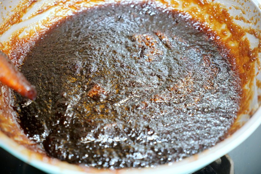 ▼平常比較少在煮糖漿的朋友建議煮滾後就轉成中小火慢煮,比較不容易燒焦,但時間要花比較久,大概要一小時以上才能煮好!比較有經驗的朋友可以持續大火煮沒關係,但要記得時常攪拌避免燒焦,也是要煮將近一小時才會完成!
