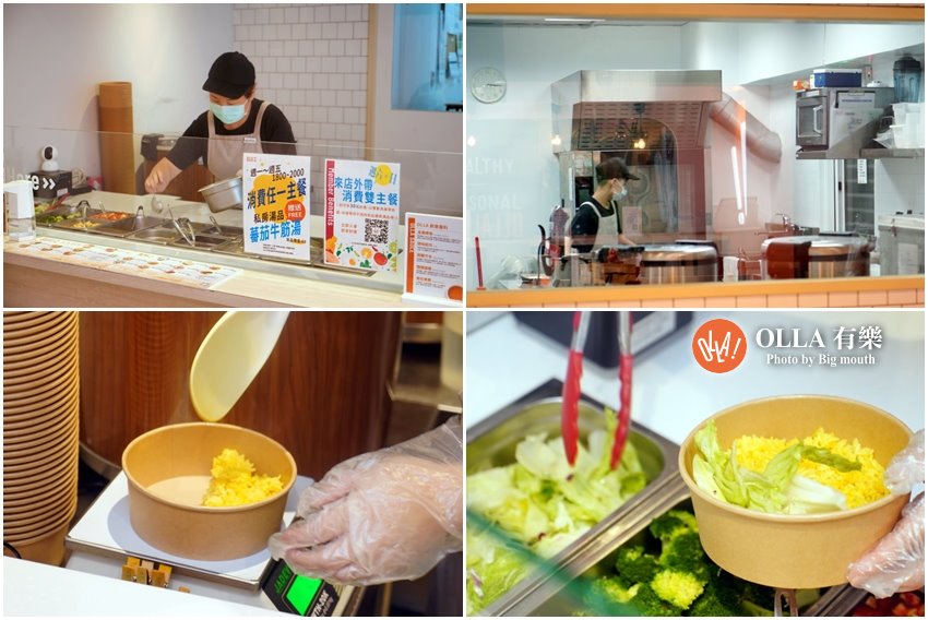 ▼這裡的餐點都是標準化出餐,盛裝米飯、沙拉的時候也會先秤重,確保份量、品質一致,才會送到消費者手上,連細節也很用心呢!主食的選擇也很多元,有薑黃飯、糙米飯、嚴選蘿蔓綜合美生菜三種,大家可以選擇一種米飯、兩種各半、一半米飯一半沙拉,又或者是想要兩種米飯各半再額外加點沙拉都可以,跟一般只有地瓜泥、馬鈴薯泥的水煮健康餐盒來說選擇更人性化!