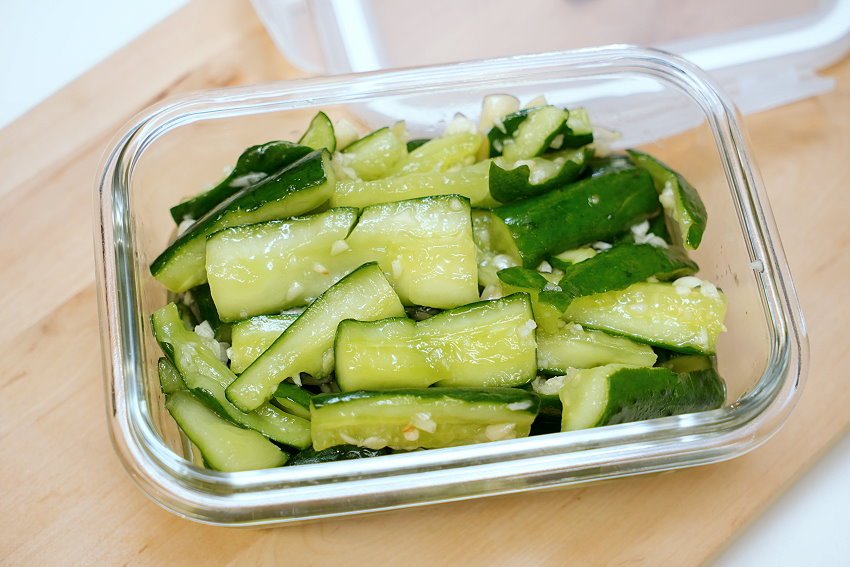 ▼將拍裂的小黃瓜放進容器中~~如果有太大塊的也可再切一半!