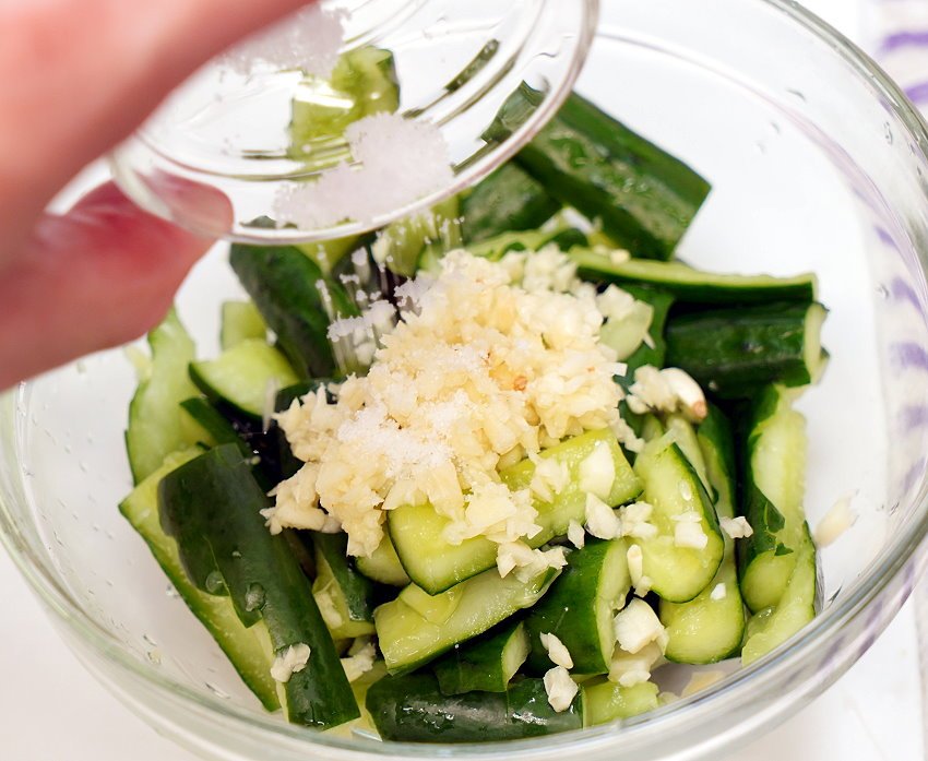 1.小黃瓜切段後用刀背拍裂,放進容器中,先放少許鹽巴抓醃後放置半小時;同時將蒜頭切成蒜末備用。