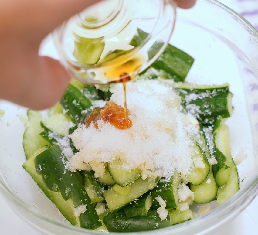 3.將蒜末、醋、鹽巴、砂糖、香油加進小黃瓜,用手抓醃後,蓋上蓋子放置冷藏至少1小時即可享用(或冰到隔天更入味喔!)。