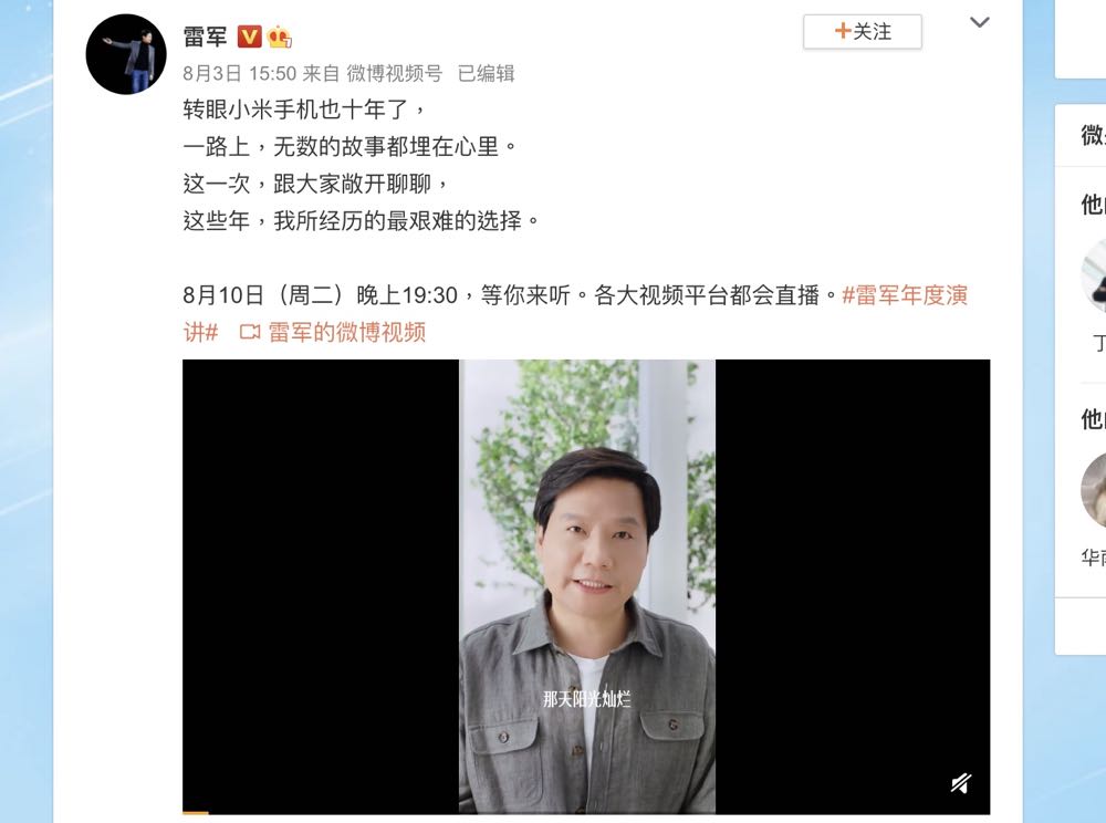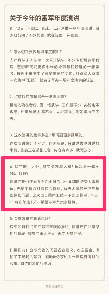 雖說 8 月 10 日(二)晚上 7:30 雷軍先生的年度演講主要是要與大家聊聊創業至今最艱難的 10 個選擇,但雷軍也緊接著表示這次演講時間大約為 1 小時,演講後會發布幾款新品、MIUI 13 會在年底發表、小米汽車則是還在進行中等資訊。