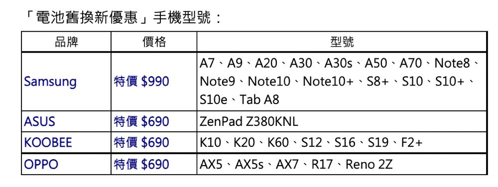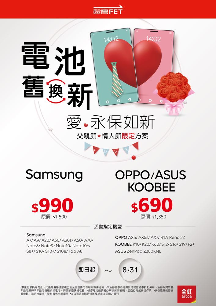目前疫情警戒仍未完全解除,手機成為防疫最佳良伴,長時間追劇、遊戲,電池的續航力更顯重要。遠傳針對精打細算的用戶推出「電池舊換新 愛永保如新」的節慶限定優惠,即日起至 8/31 止,只要手機為 Samsung、ASUS、KOOBEE 及 OPPO 等品牌的指定型號,就可享有電池舊換新的優惠價格,讓手機電池重獲新生!