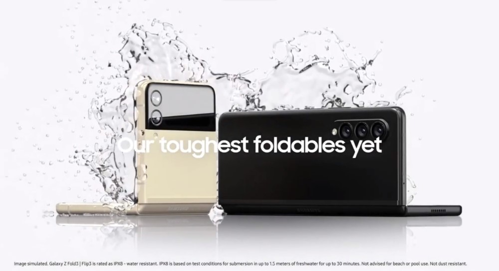 在 30 秒宣傳影片中,Galaxy Z Fold 3、Z Flip 3 均通過 IPX8 防水認證,手機可於深度 1.5 公尺水中浸泡 30 分,不具防塵功能。