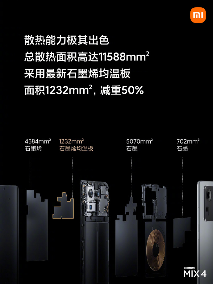 規格上使用高通 S888+ 處理器、4500mAh 電池容量、120W 有線充電、50W 無線快充、最快 15 分鐘就能充滿。在散熱方面,小米也表示在材料科技上採用石墨烯均熱板,能夠降低用戶使用時的溫度提升。