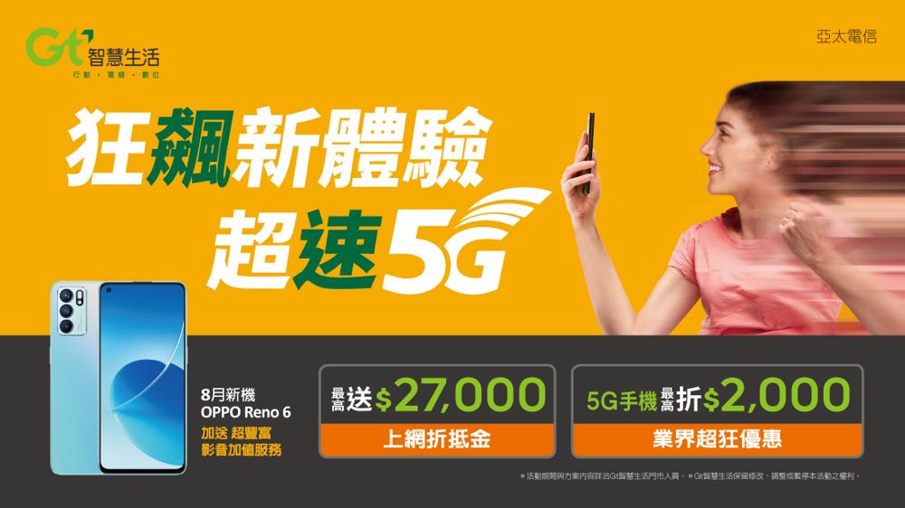 針對高速上網需求用戶,月付 1399 元,享 5G 不限速上網吃到飽,搭配 OPPO Reno6 5G 新機,專案價只要 990 元(單機價 16,990 元),不僅專案價業界最優惠,再加贈 Gt TV 隨選館及 KKBOX Hi-Res 無損音質服務各 1 個月免費優惠。