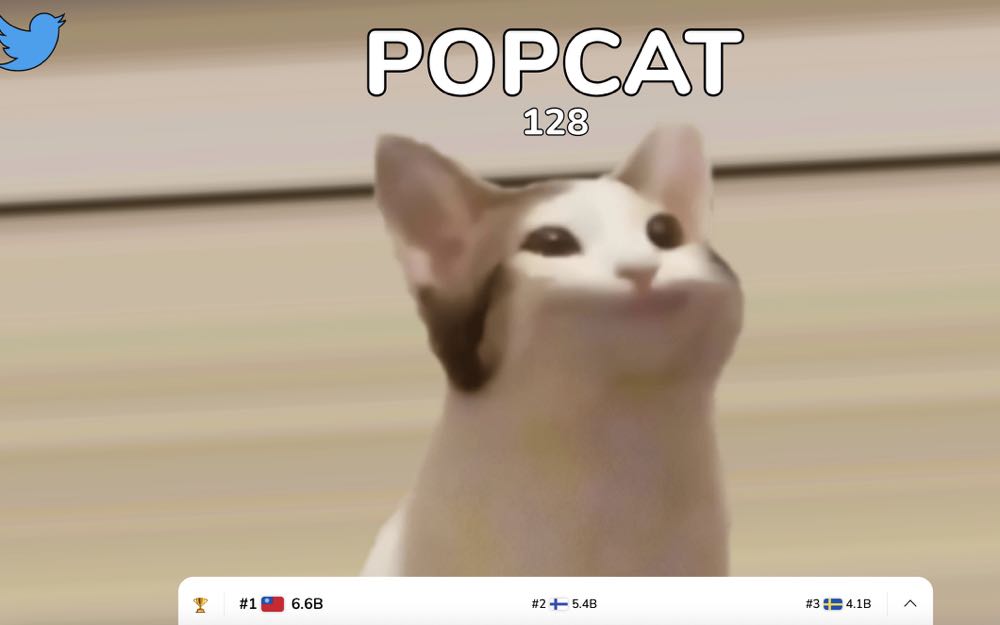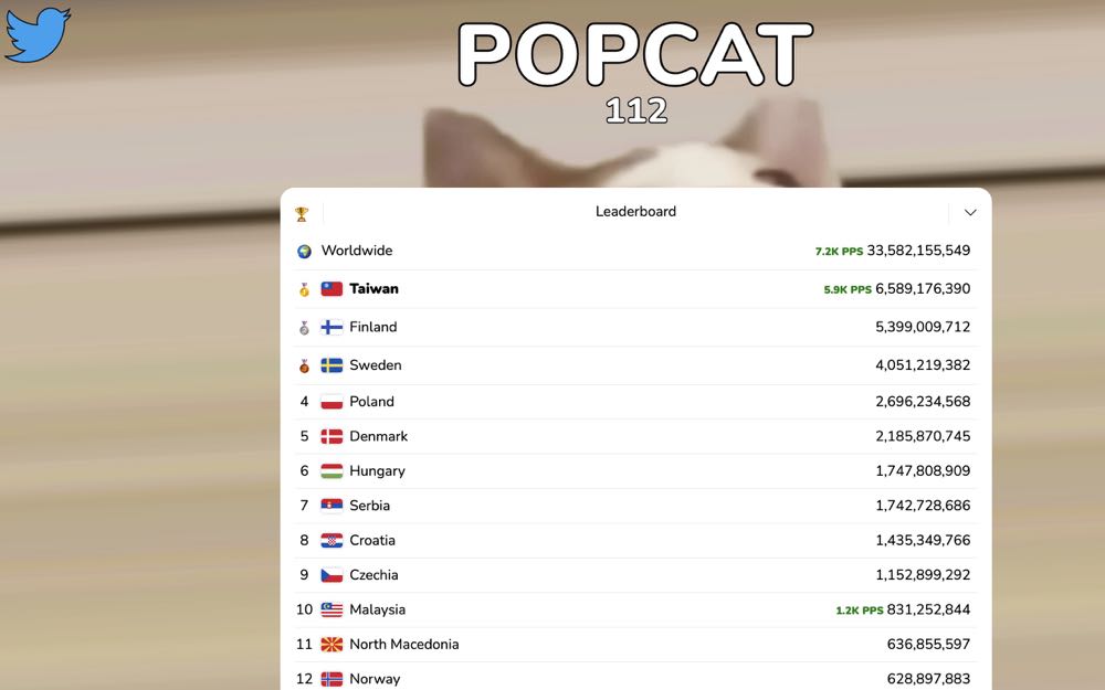 至於現在 Twitter 上的「POPCAT」小遊戲,只要點擊鍵盤或滑鼠來讓貓咪張嘴就可以獲得一分,最特別的是遊戲下方還會列出各國的點擊總數排行榜,竟也意外引發了一場 世界鍵盤大賽,吸引全世界的網友們紛紛來參與,要讓自己的國家與國旗出現在排行榜上。