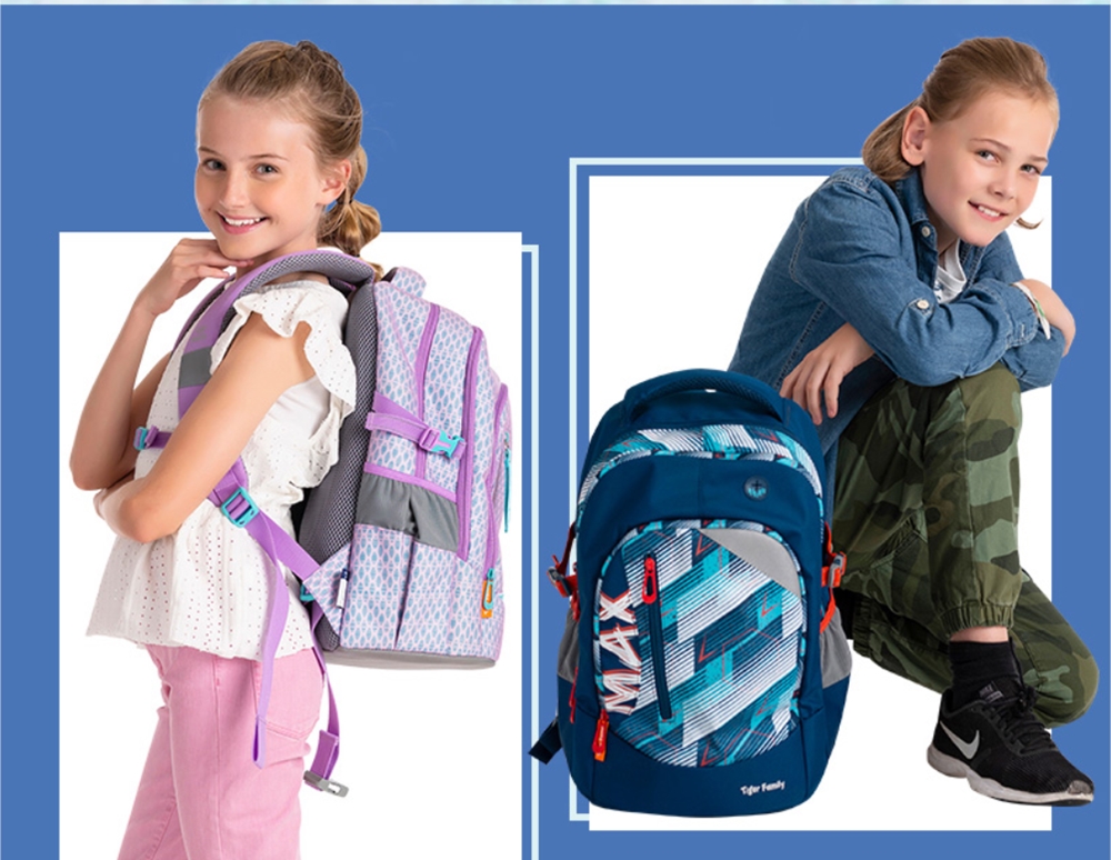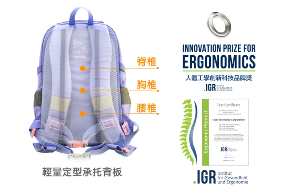 Tiger Family 是歐洲已經熱銷 800 萬顆以上的護脊書包品牌,產品通過歐盟嚴格檢測標準,是國外媽咪們安心的選擇,現在最新色台灣也能買得到! Max 書包採用防潑水布料,無毒、無害的安全材質製成 ,背帶採用加寬的 S 型,能分散肩部承受的壓力;背部採用輕量定型承托背板,榮獲德國人體工學創新科技品牌獎,能完善保護到孩子們的脊椎、胸椎、腰椎。