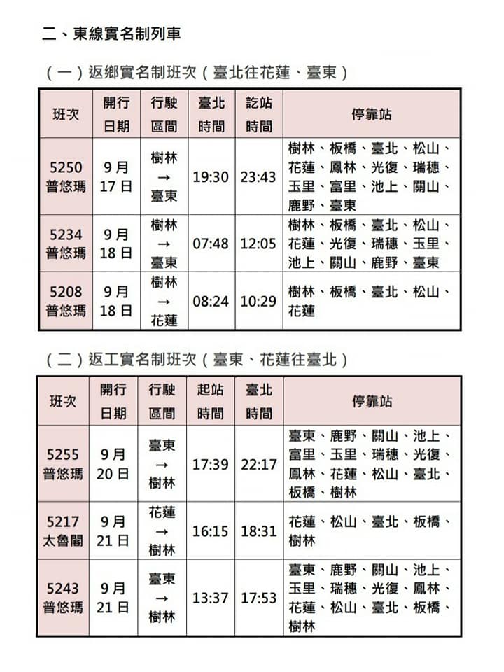 另 9 月 18 日至 21 日東線 6 班實名制自強號班次,於 8 月 21 日(六)0 時起開放 110 年 8 月 1 日前設籍於花蓮縣、臺東縣之現住人口與國民身分證統一編號第 1 碼為 U 或 V 及上開兩者之配偶與直系血親 1 親等國民訂票。