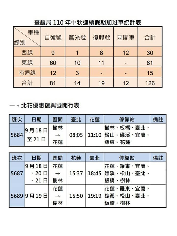 因應 110 年中秋疏運旅客需要,自 110 年 9 月 17 日 (五) 起至 9 月 22 日 (三) 止計 6 天,全線加開各級列車總計 126 班次(如下圖)。其中包含東部地區 9 月 18 日至 21 日加開樹林-花蓮復興號 8 班,並提供北宜 100 元、北花 200 元優惠票價及 9 月 17 日、 9 月 20 日連假離峰時段加開樹林往返臺東七折紅眼列車。