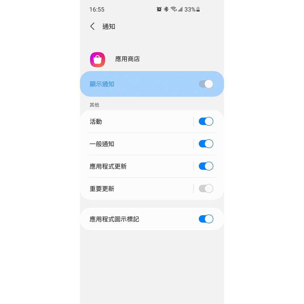 如此一來,手機就不會收到三星產品、服務的促銷活動通知,但廣告仍會顯示於 App 主畫面上。同樣方法在其他三星應用程式也適用。倘若不放心,你還可以在系統設定中關閉活動通知(以 Galaxy 應用商店舉例):