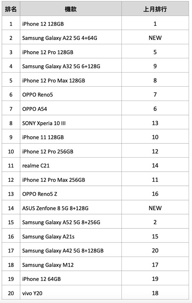 Top 20 也是有著大幅度變動。Apple 7 月拿下 7 個席位、Samsung 則是擁有 6 席,並且除了 Galaxy M12 外,通通由 A 系列吃下; OPPO 3 席,Sony、realme、ASUS、vivo 各一支代表。