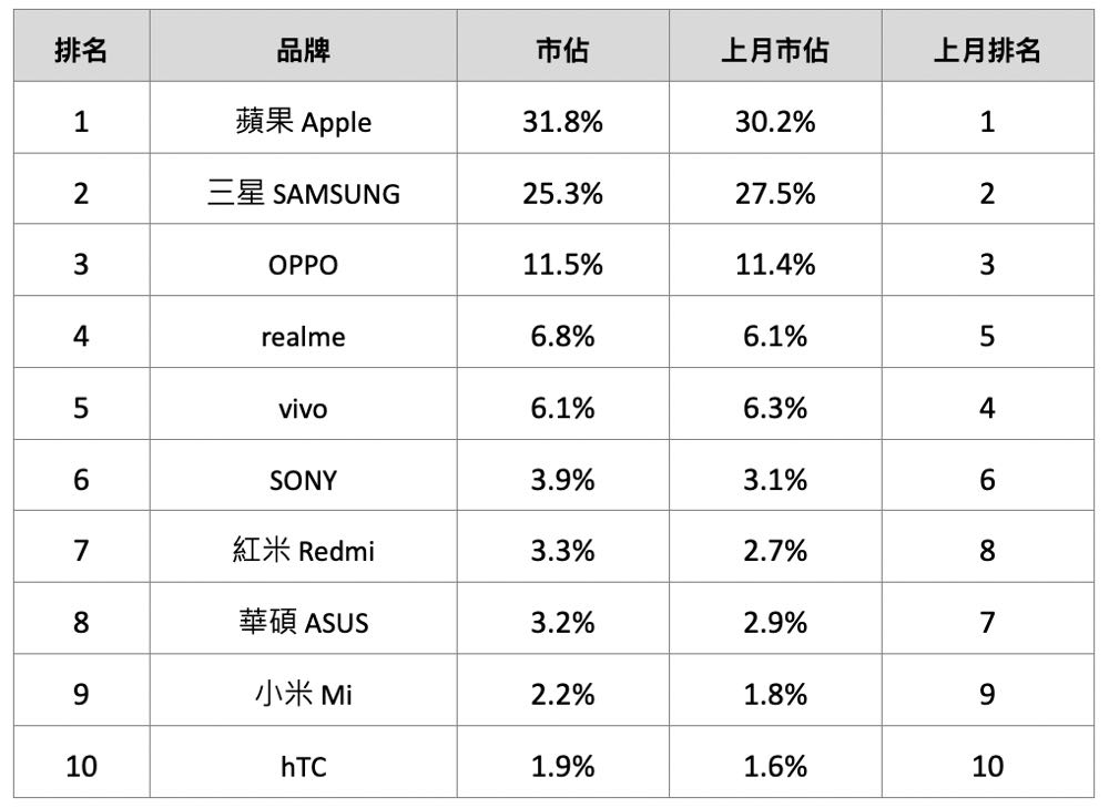 在市佔排行中名次變動並不算大,第 4 與 第 5 名的 vivo 與 realme ,以及 第 7 與 第 8 的華碩與紅米互調外,數字方面則是 realme 、Sony、紅米有超過 0.5% 的成長。