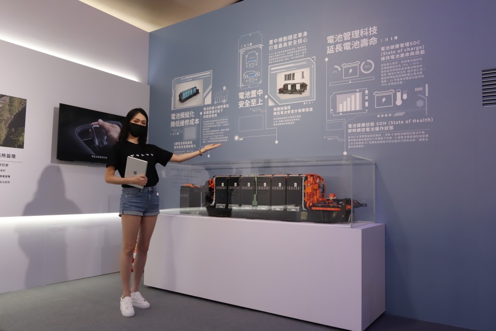 展區一旁的牆面以深入淺出的文字說明 Volvo PHEV 優勢,包含有別於其他品牌將電池置於車體正中央的目的,讓車體重心偏低,進而提升操控與反應,也可避免不幸事故發生時,電池受到車體擠壓或刺穿的風險,確保整體行車安全性;另一側的牆面將重達 700 公斤、由 6 顆電池模組串聯而成的 400V 鋰電池組拆開解密,說明 Volvo PHEV 智慧電池管理科技是如何讓電池模組在 15 年後仍能保有 70% 的電能容量。
