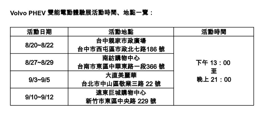 國際富豪汽車為讓更多民眾深入認識 Volvo PHEV 雙能電動先進且綠能的動力科技,特別舉辦 「Volvo PHEV 雙能電動體驗展」,自 8 月 20 日於台中站起跑,依序於台南、台北及新竹等地巡迴,活動除可近距離欣賞及試駕 Volvo PHEV 車款,還有特地從瑞典原廠空運來台的 PHEV SPA 展示底盤,消費者可以挑戰數位互動遊戲換取精美小禮,歡迎親子同樂共渡愉快週末時光。
