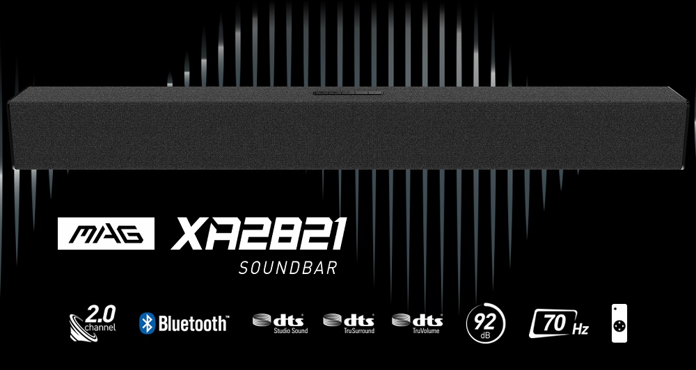 MSI 微星 MAG XA2821 2.0 聲道長型音箱配備 2 個全頻喇叭與 2 的被動輻射器,響應頻率為 70Hz – 19KHz、音壓為 92dB、輸出功率則是 10W。另外,它還支援藍牙無線傳輸播放以及遙控器控制,手機、平板、電腦甚至電視也能輕鬆使用。
