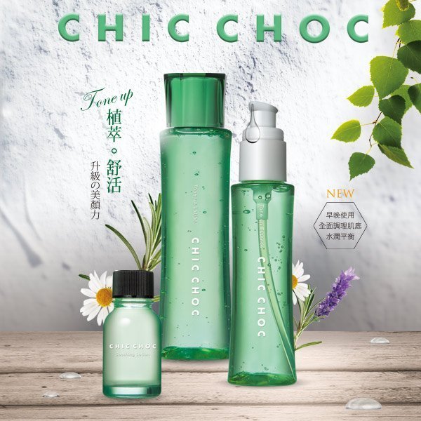CHIC CHOC 植萃舒活系列能調理肌膚水油平衡,及增強防禦力,草本新能量的獨家配方,能調理油水平衡、溫和舒緩肌膚不適感。推薦可使用植萃舒活化妝水大量濕敷,針對需要防護的口罩肌部位,再使用植萃舒活重點露,化妝前後皆可使用,一組直接買齊。