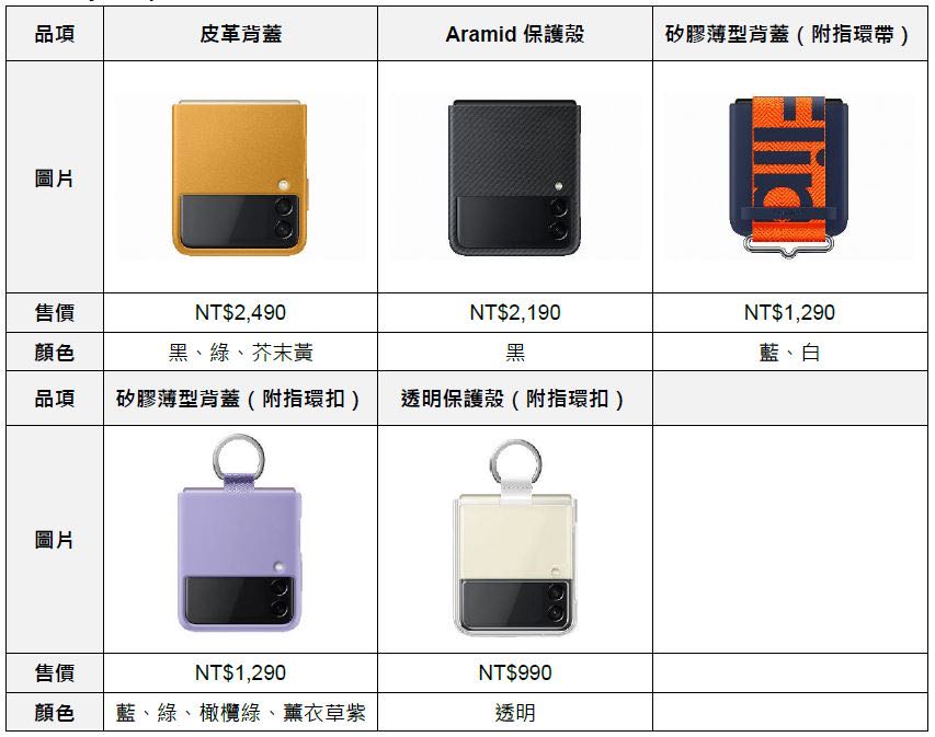 – 購買 Galaxy Z Flip3 5G,上網登錄即可獲得:【透明保護殼(附指環扣,建議售價 NT$990)】、【藍牙智慧防丟器(建議售價NT$990)】、【無線閃充充電板(9W,建議售價 NT$1,290)】。