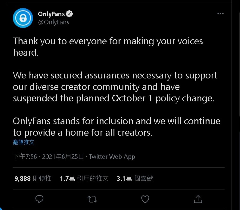 0499277302816773″>推文中表示,確保多元化的創作者社群所需的保障,將暫停原訂於 10 月 1 日更新政策的計畫,最後一行寫道:「OnlyFans 代表包容,我們將持續為所有創作者提供一個家。」