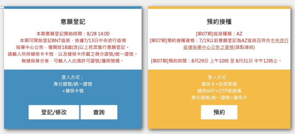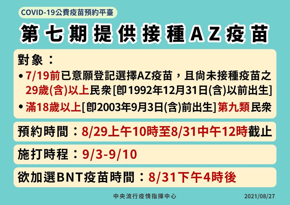 若符合第七期 AZ 疫苗預約資格對象想要加選 BNT 疫苗,必須於 8 月 31 日下午 4 時後始可加選。