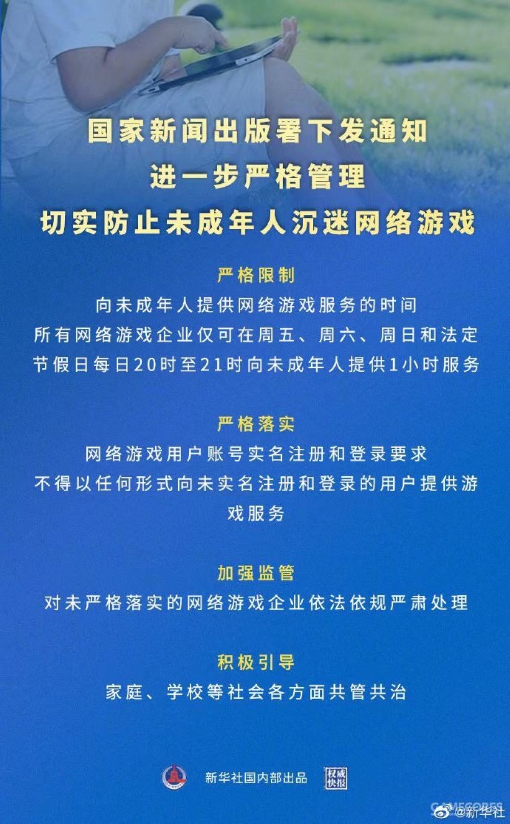此前,中國遊戲企業已公布對未成年人的遊戲限制措施。2021 年 8 月 3 日,騰訊宣布限制未成年人的上線時長,非節假日由 1.5 小時降至 1 小時,節假日由 3 小時降至 2 小時,並且禁止未成年人任何遊戲內消費。同一天,網易遊戲表示要升級未成年人識別認證的技術,同時針對未成年人遊戲時間、遊戲消費進行「合理限制」。