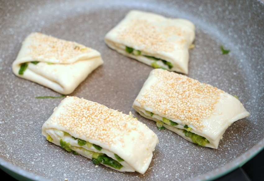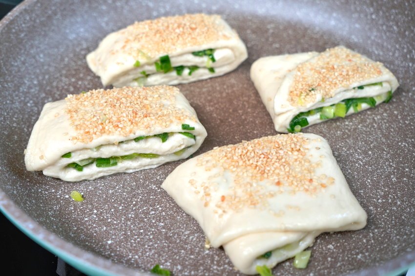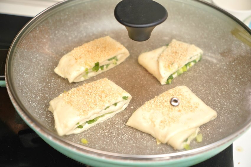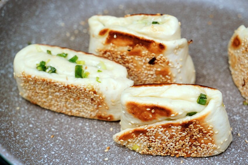 熱鍋後放入一點豬油或沙拉油,麵團放進去小火香煎,正面反面側面都要煎,煎到微焦、中煎熟透即可起鍋。