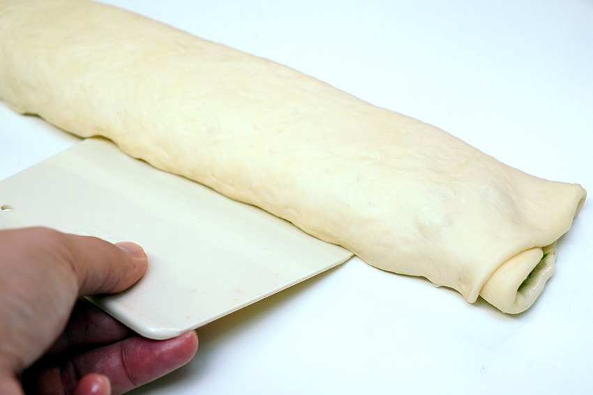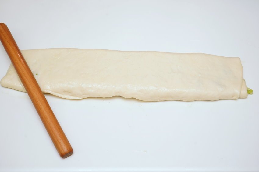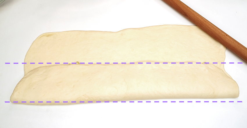 6.將做好的麵團再稍微擀壓一下,最後用刮刀將最後對摺的邊邊收進去即可。