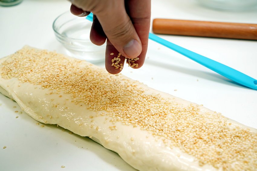 7.將1比1的砂糖倒入溫熱水中攪拌溶解做成濃糖水,在麵團上刷上一層糖水,再灑上白芝麻粒。