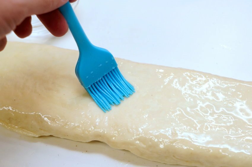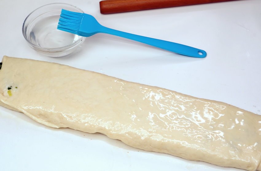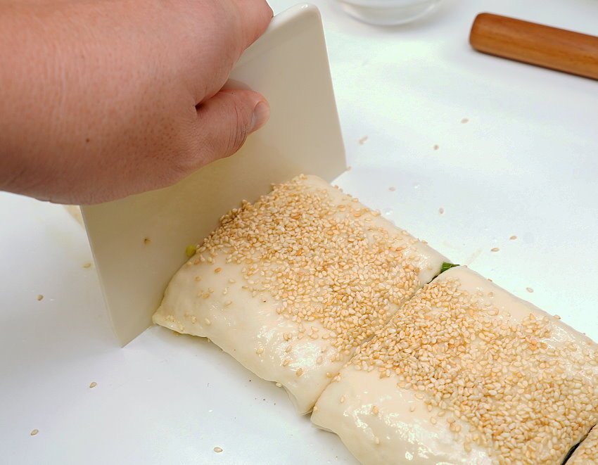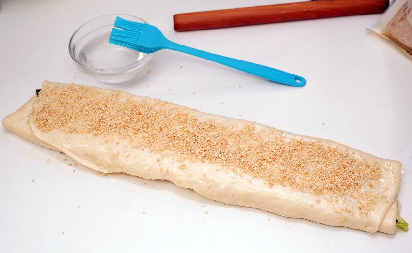 ▼剛剛對折的地方稍微擀一下,讓蔥餡跟麵皮更黏合,再刷上一層豬油增添香氣!