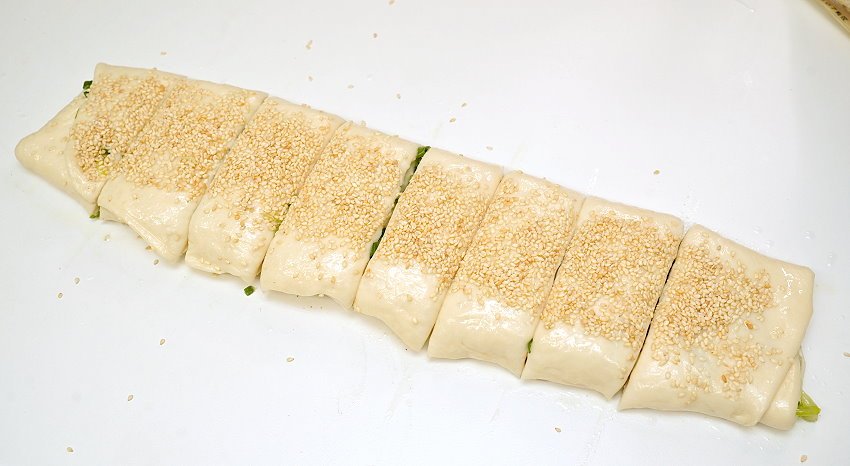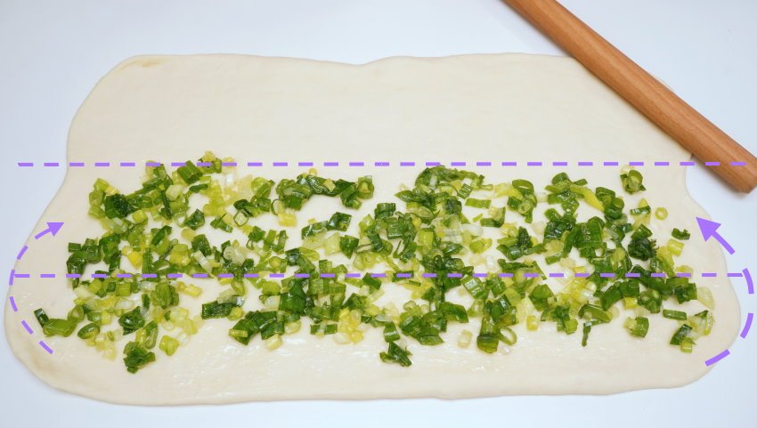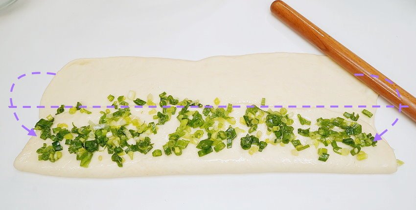 ▼接著鋪上蔥餡,就可以將上面1/3的麵皮往下對折~~