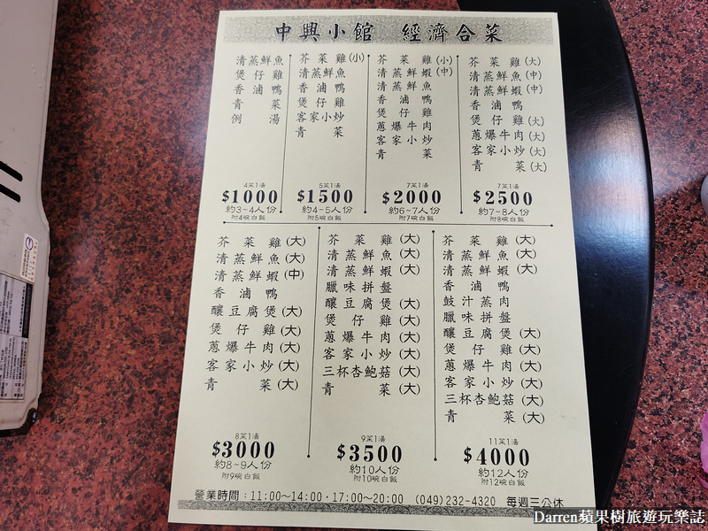 ▼中興小館合菜菜單,有1000元、1500元、2500元~4000元等價位