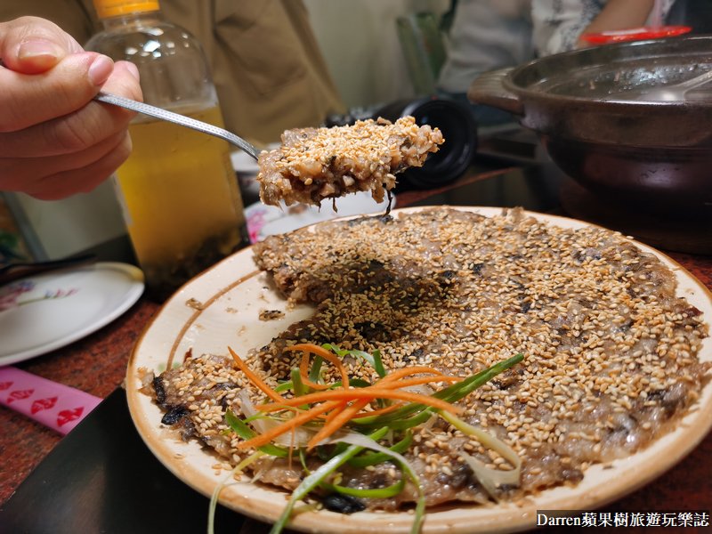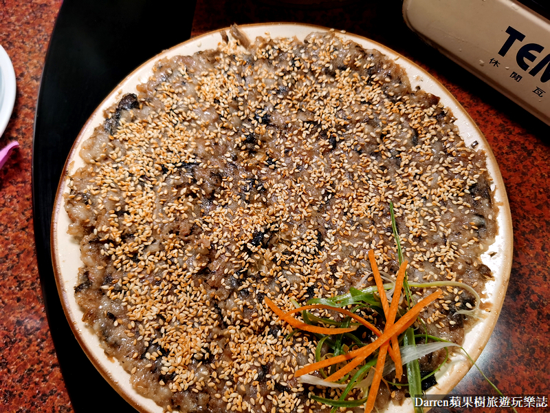 梅菜肉餅是粵菜系眷村菜經典料理之一,以梅菜乾以及肉末為主,使用蒸菜方式來料理,上面還有滿滿芝麻,鹹香下飯入口還有芝麻香氣