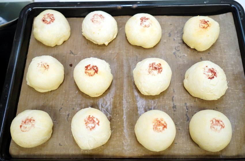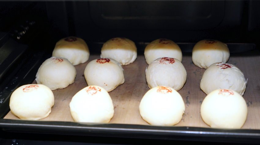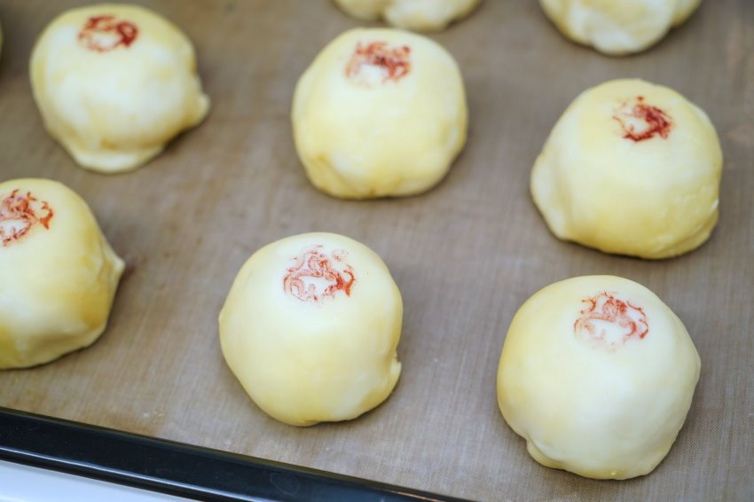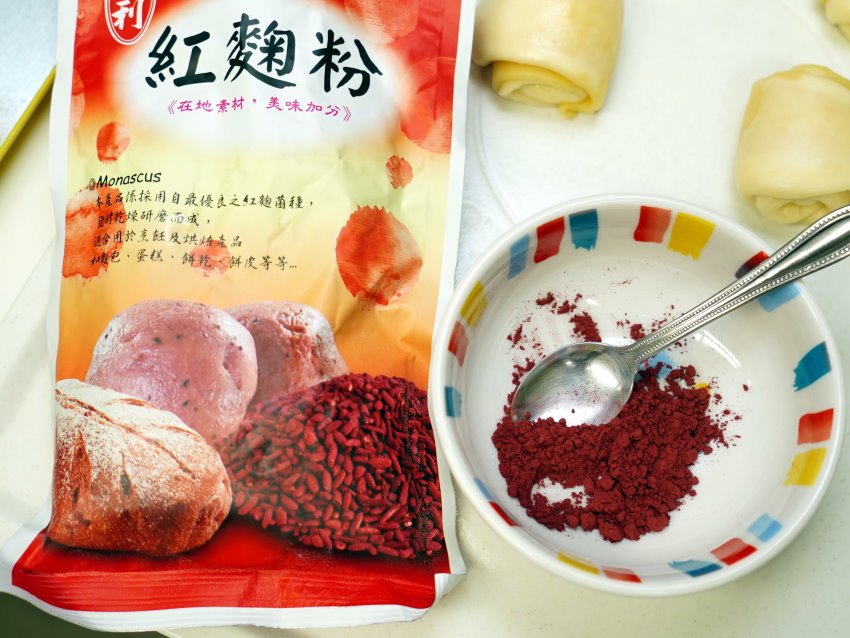 ▼用紅麴粉的好處就是烤熟後看起來顏色也會比較剛好~~而且又是天然的色素,吃起來也更加安心!如果家裡沒有木章的朋友,也可以用筷子底部來蓋章唷!