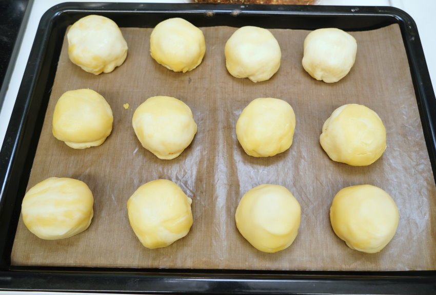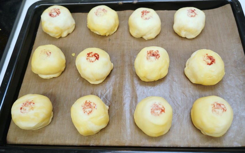 5.分好12等份(油皮每顆23g、油酥每顆15g),再將油皮包入油酥,蓋上保鮮膜鬆弛15分鐘。
