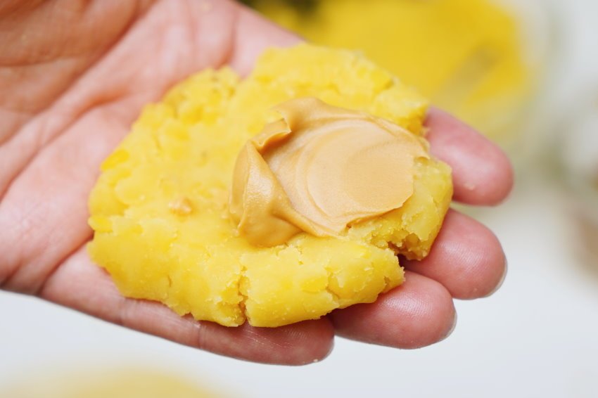 ▼花生口味就挖一匙花生醬到綠豆餡中即可(如果有顆粒版的花生醬更好),不過花生醬不是太好包,所以建議大家不要一次加太多,免得會到處流竄出來(笑)!