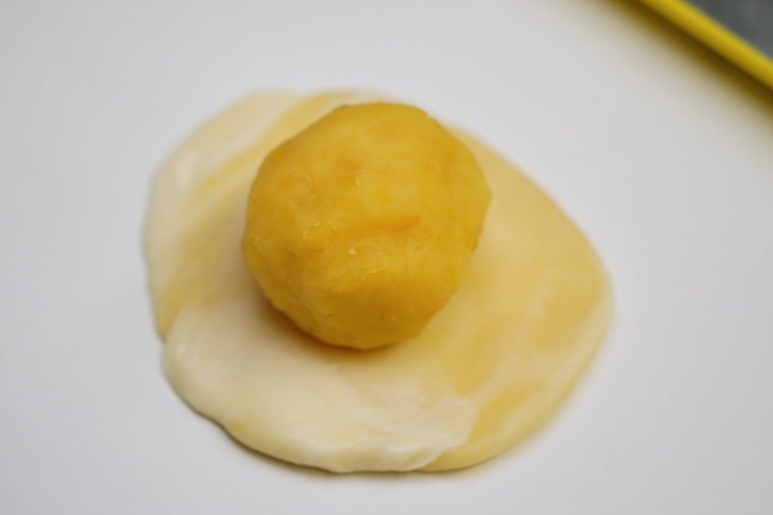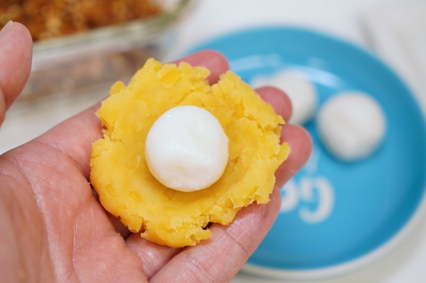▼將包裹好內餡的綠豆餡包進麵皮裡就完成啦~~記得收口朝下會比較漂亮!這個版本的麵皮最大可以包約 50 g的內餡,我自己比較喜歡做成像蛋黃酥的大小,內餡大約40~45 g 左右,會做這個大小一方面是因為外面買的公版禮盒才放得下,二來是小顆吃起來比較不會讓人吃得太膩,提供給大家參考。