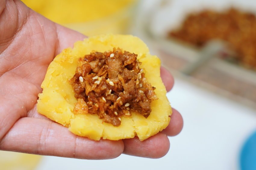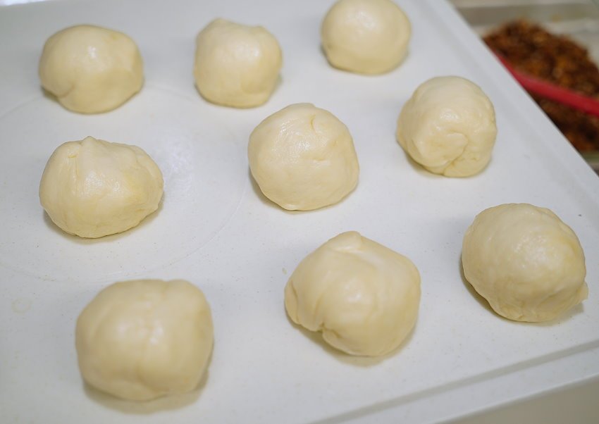 ▼滷肉則有兩種做法,第一種是先將炒好的滷肉跟綠豆餡拌在一起,然後再直接包進麵糰裡即可;大口做的是第二種是用綠豆餡包入滷肉,再用麵糰包起來,吃起來也比較有層次!