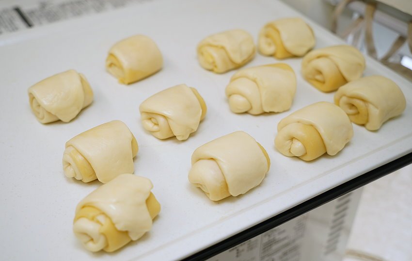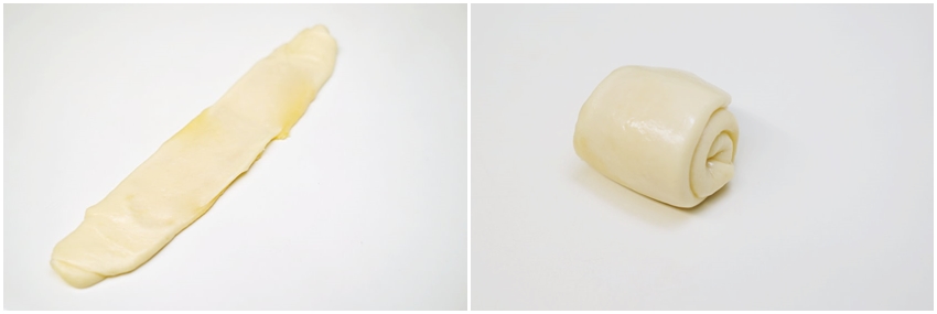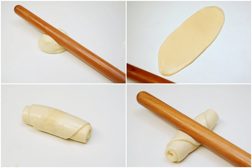 ▼鬆弛好之後,將麵團壓扁,擀成牛舌餅般的長條狀後捲起來~~連續做兩次就對了!