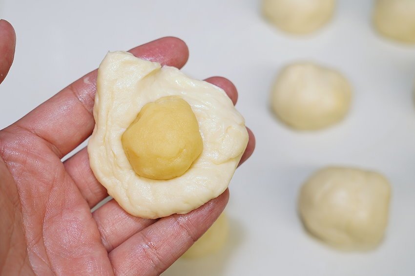 ▼如果只想吃原味朋友,直接將分好的綠豆餡包入麵糰中即是原味;我們這次想做比較多變化的口味,首先做的是麻糬,綠豆餡包入Q心仁再包入麵糰即是麻糬口味~~