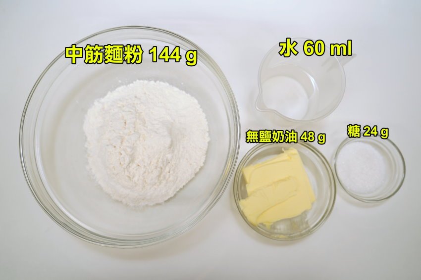 中筋麵粉 144 g、冷開水60 ml、砂糖 24 g、無鹽奶油 48 g