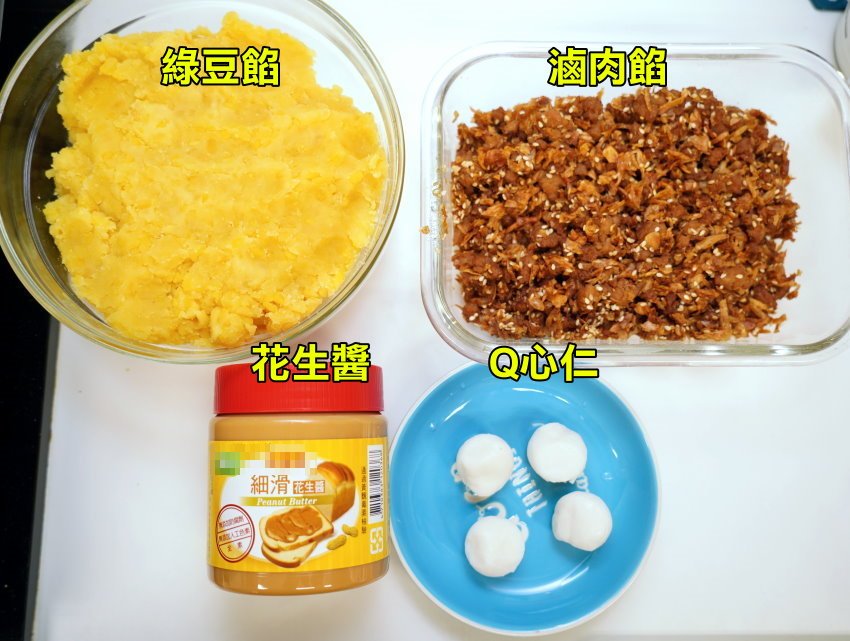 ▼內餡準備好囉~這次大口要挑戰三種口味的綠豆椪,所以有滷肉餡、花生醬與Q心仁,先分別包進綠豆餡中,再用外皮包裹起來!
