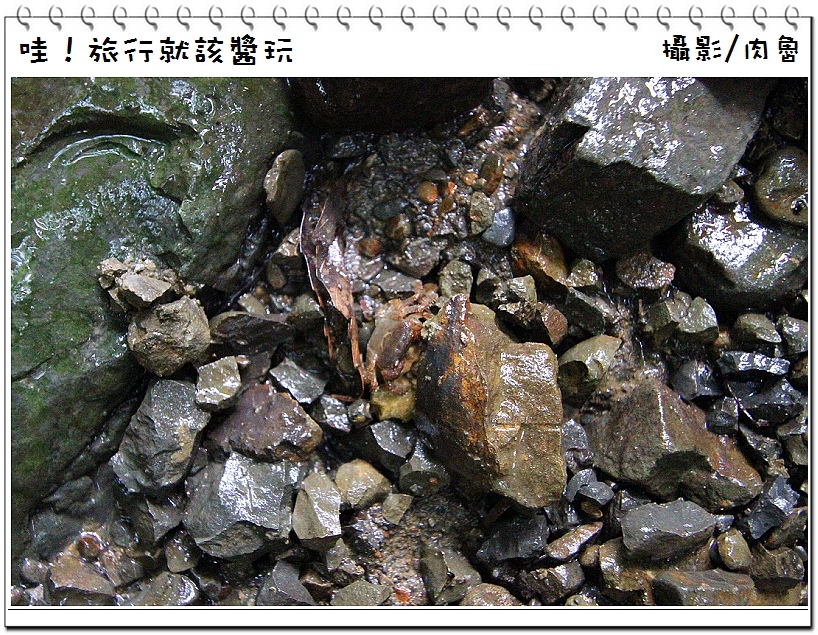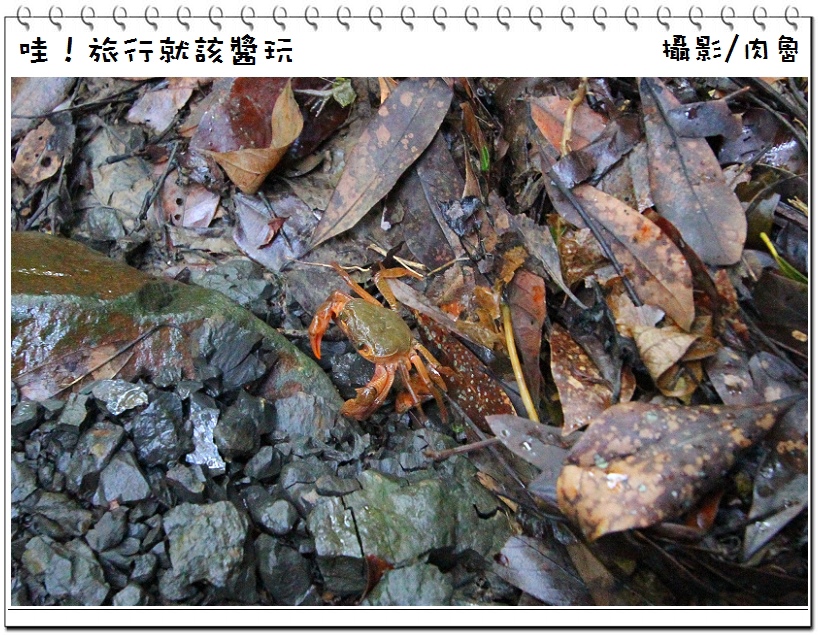 ▲在欖仁溪的溪流裡,也會發現好多螃蟹呢,在海邊看見螃蟹橫行不稀奇,在溪流裡能看見螃蟹,真會讓人發出尖叫聲,而且螃蟹一見到人類,馬上飛頭往石縫裡頭鑽進去,暗紅色澤也是螃蟹與生俱來的保護色,也足見欖仁溪的生態保存得非常完好。
