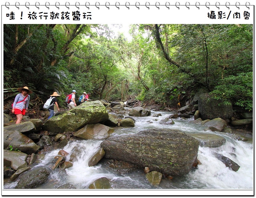 ▲經過約20幾分鐘的講解過程,終於我們抵達欖仁溪畔了,看見了不太湍急的溪流,也讓大家瞬間暑氣全消,小孩子更是一馬當先蹦蹦跳跳渡河呢,大概只到膝蓋深度而已,踩好每一步就很容易渡過溪流了,一腳踩入真的是冰涼直達心頭,恆春半島30幾度的高溫在這裡瞬間降了5-8度,也讓我渡溪後又下溪泡泡雙腳,真的是過癮!