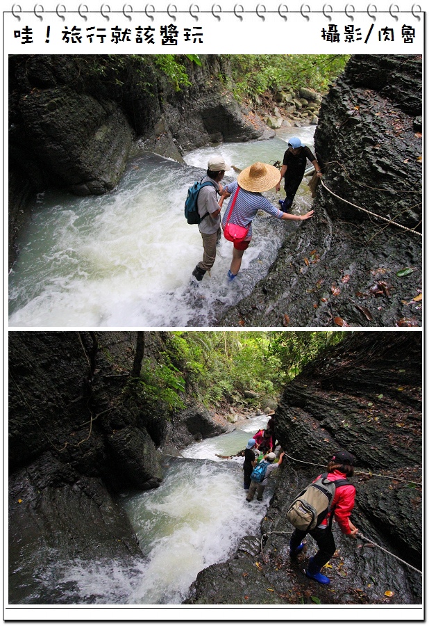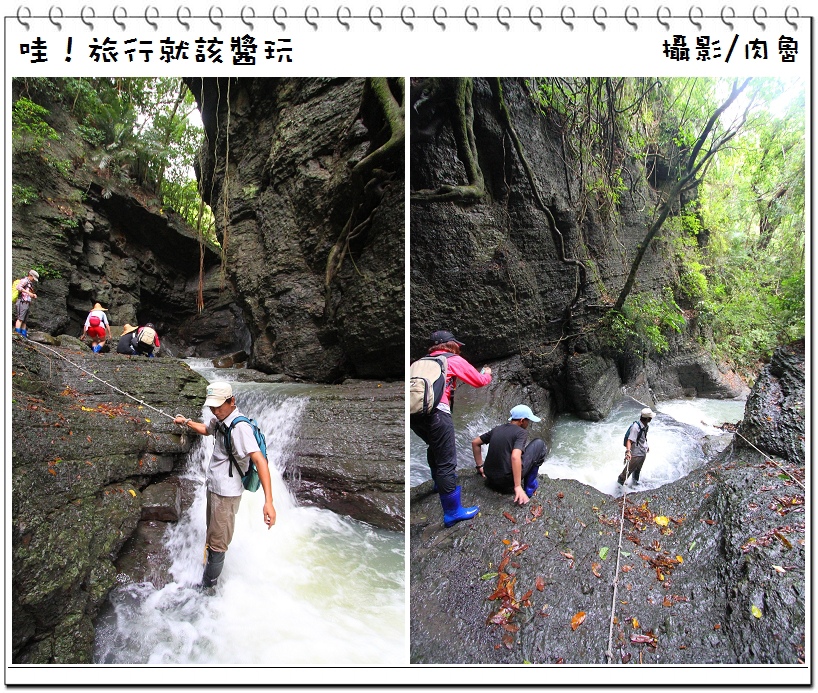 ▲總算…在眼前看見了一個突起聳立的黑色峽谷,解說老師大聲跟大家說:我們到囉!這一段因為溪瀑更加湍急,老師也在一旁拉著繩子確保安全, 一腳踩踏上去便可看見欖仁溪瀑布囉。