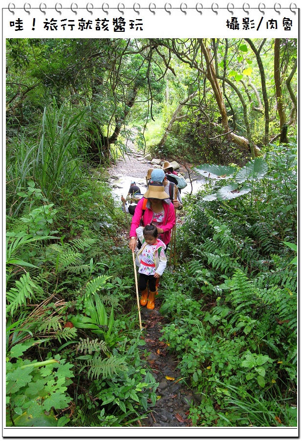 ▲連這麼小的小朋友都勇敢過溪了,就可以知道欖仁溪難度其實不高,過溪後的羊腸小徑行走時要特別注意,要用長棍子撥撥前方的植物,以免有蛇躲在前方喔,打草驚蛇是行走步道時很重要的一環。