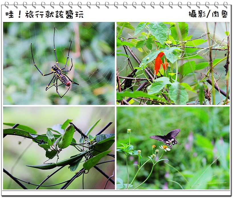 ▲黑色鳳蝶(右下)、黃色湖蝶、人面蜘蛛(左上)、橘色山苦瓜(右上)、羊蹄角植物(左下),隨處可見這些動植物生態體系,欖仁溪幾乎沒有人為破壞,也因此隨處就可見蝴蝶飛舞,隨手一指便是教科書內容。