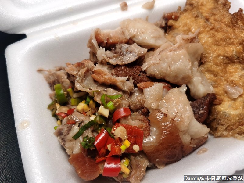 豬腳跟排骨都是人氣菜色,直接跟老闆說要點豬腳,老闆就會從滷鍋撈出豬腳,然後用剪刀將豬腳肉通通剪下來,手腳非常俐落啊!!豬腳吃起來很軟Q又入味,加辣更好吃唷