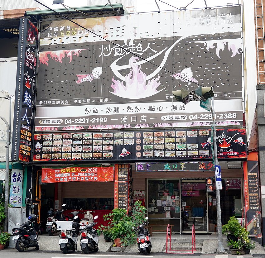 ▼炒飯超人(漢口店)就在台中市北區漢口路三段、太原六街交叉路口,大大的扛棒非常顯眼好找!附近有路邊車格也有付費停車場,騎車的朋友可以直接停門口更方便!