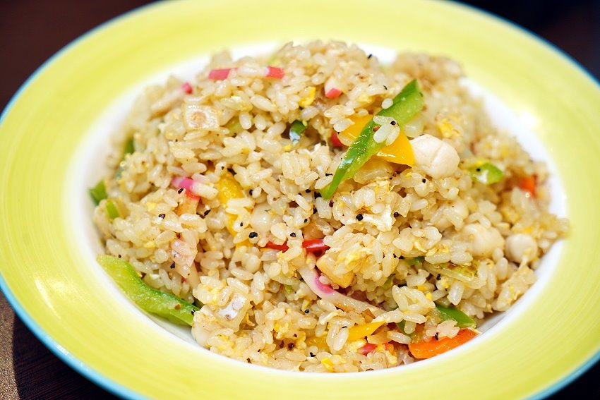 ▼奶油干貝炒飯,也是店家新研發的炒飯,採用奶油先將小干貝炒熟後,再加入米飯、彩椒及其他配料下去大火翻炒,看起來繽紛又多彩。